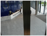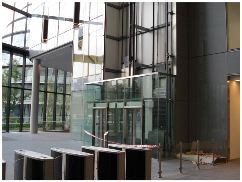 It was desired to enter the cars as quickly as possible after entering the building, therefore this meant from the atrium itself rather than walking though the atrium and entering from behind the lifts. No lift well was desired, other than the statutory 2500/3500mm safety screening, so this in turn meant that there would be a car entrance with nothing beyond it when not at floor level.