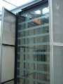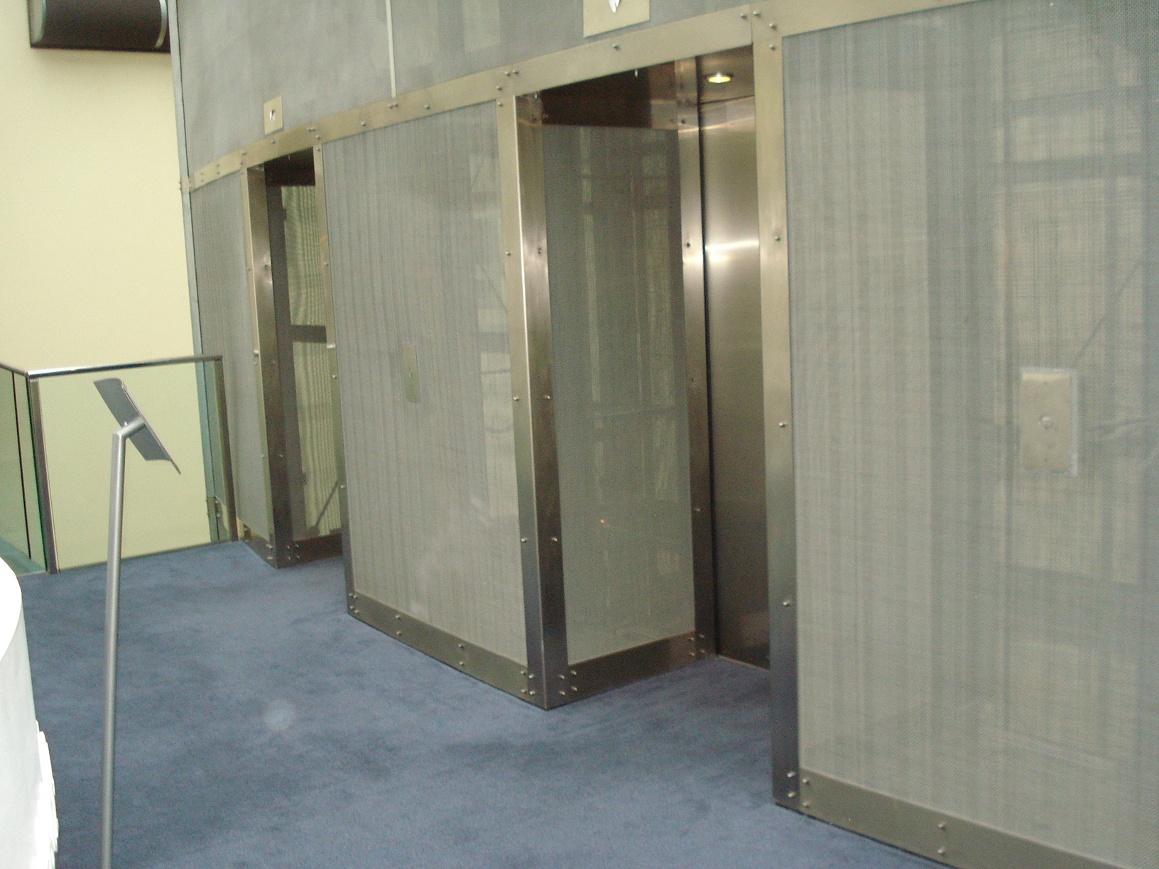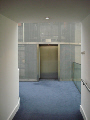 Unusually, the lift contractor and ourselves had two different designers responsible for the appearance of the lifts and their surroundings. Sir Terance Conran was part of the client group and his design studio, CDP, were responsible for the Ground floor, this being where the restaurants were located and this lift lobby was part of this ‘ambiance’. Manser Associates were charged with more mundane things such as Building Regulations’ approval and hence were responsible for the lifts on the upper floors. Such a partnership produced some interesting results — the upper floor landings are strikingly different from those at the Ground, using ‘chain mail’ for the front walls of the lift well to allow a hint, but no more, of the lifts moving past a floor, while the lifts are almost hidden at the Ground floor.